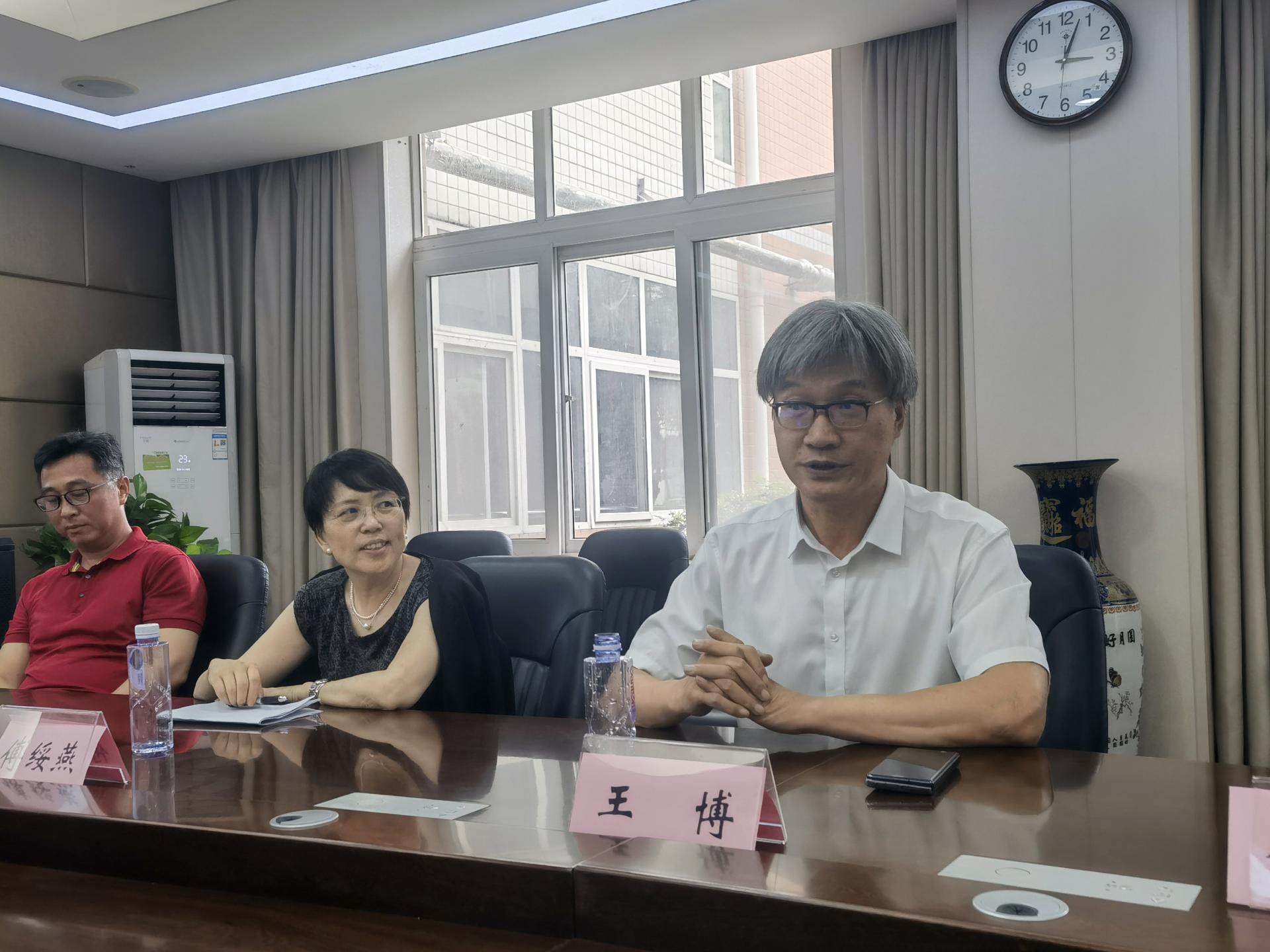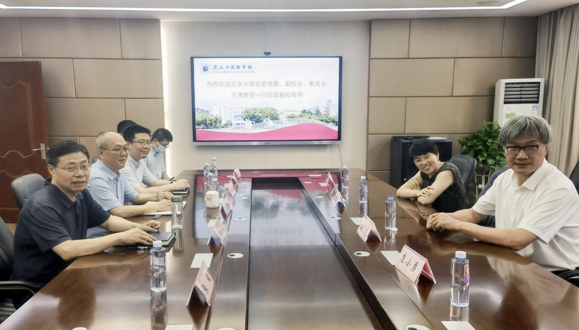 6月23号下午北京大学王博副校长一行六人来访。来访人员:王博(北京大学党委常委,副校⻓、教务⻓),傅绥燕(北京大学教务部部长),洪星星(北京大学教务长办公室),崔小勇(北京大学经济学院,北京大学湖北招生组组长),宋亚云(北京大学中文系副系主任,湖北招生组副组长),刘先华(北京大学信息科学学院,北京大学湖北招生组副组长)。