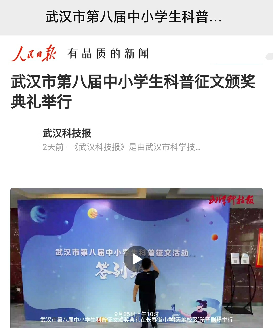 2021年9月25日,由武汉市科协、市教育局共同主办,武汉科技报、武汉科技馆、武汉科技传播研究会等单位承办的“我的科学梦”武汉市第八届中小学生科普征文获奖名单揭晓。该项活动也受到《人民日报》的关注。