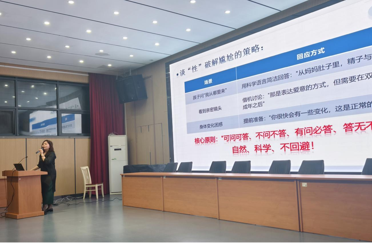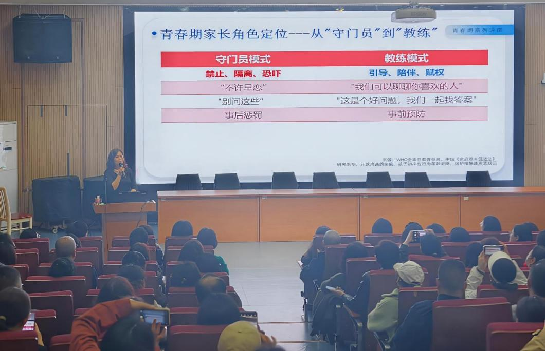 黄老师从医学和心理学的双重视角,明晰讲授了青春期孩子身心的变化和缘由,就家长最关心的实操问题进行了指导,主要聚焦“如何科学观察、如何有效沟通、如何灵活应对”这三个问题。她强调,科学观察是起点,有效沟通是关键,灵活应对是艺术,当孩子提出敏感问题时,家长如何做到不评判、不恐慌,而是成为让孩子信任的支持者和引导者。在互动答疑环节,现场家长踊跃提问,问题涉及“如何辨别网络信息的真伪”“如何引导孩子建立健康的异性交往边界”等真实困惑。黄老师耐心回应,既专业又温暖,赢得了阵阵掌声。