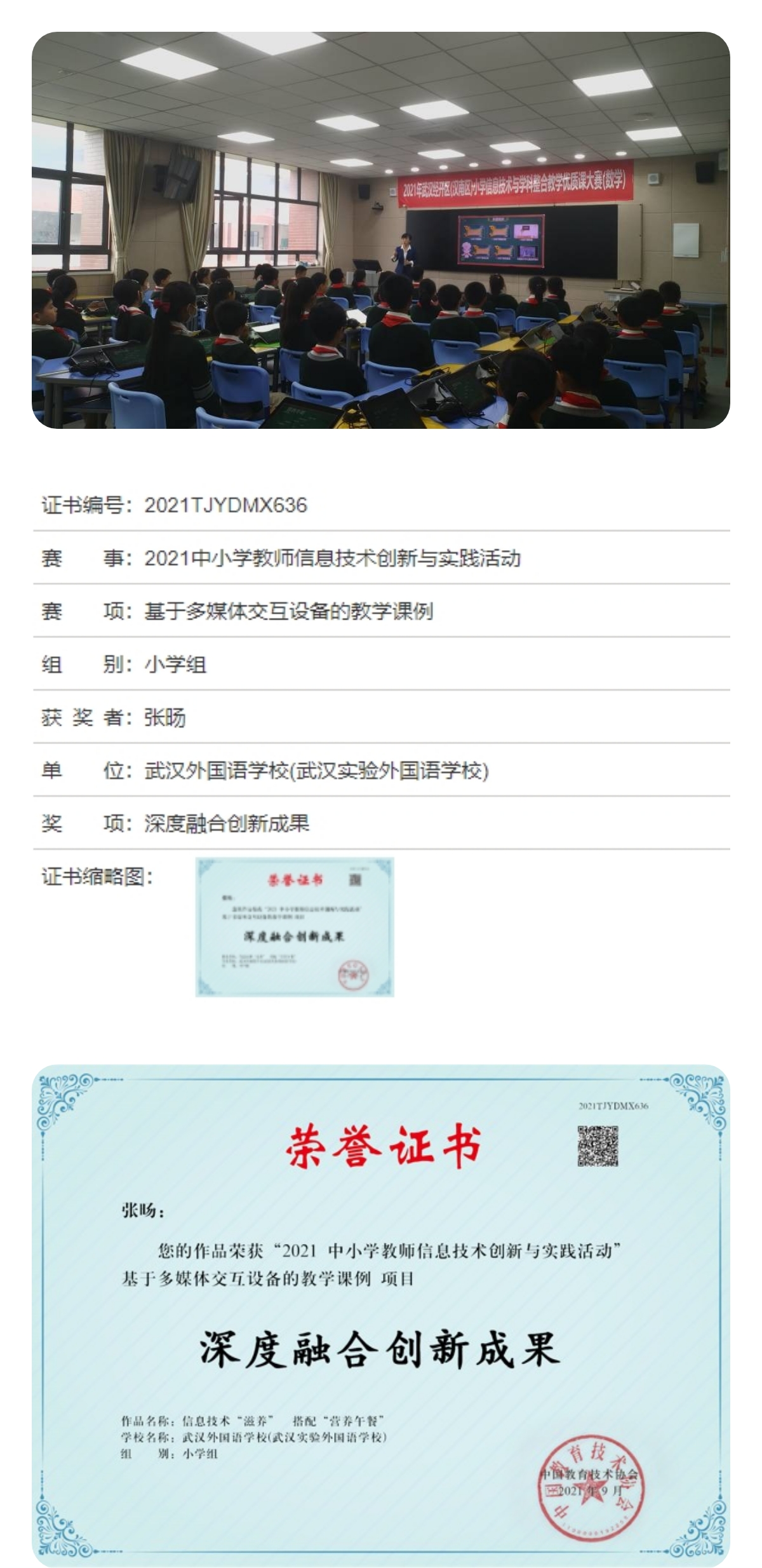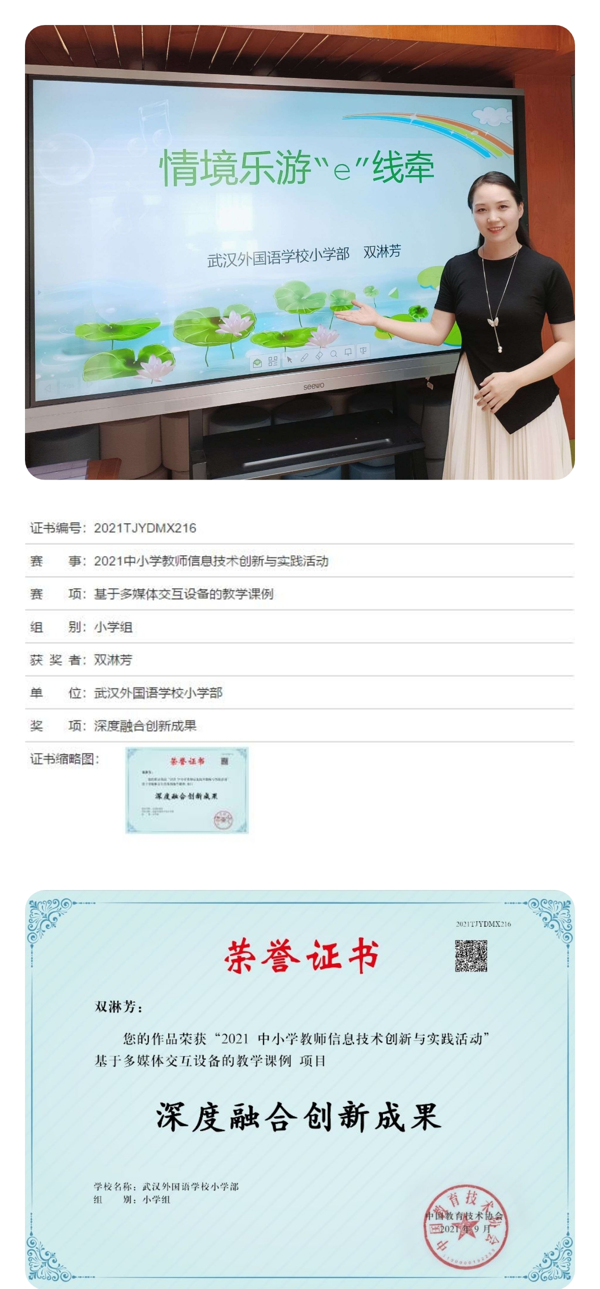 正是在这样充满希望与收获的季节里,外小教师团队也迎来了收获的时刻!在2021年中小学教师信息技术创新与实践活动中,武汉外小张旸、双淋芳两位参赛教师均获得“深度融合创新成果”大奖。