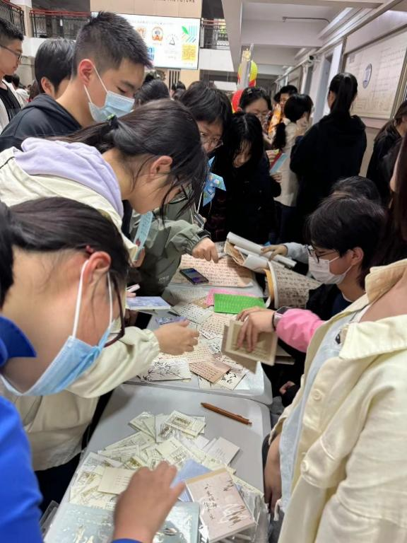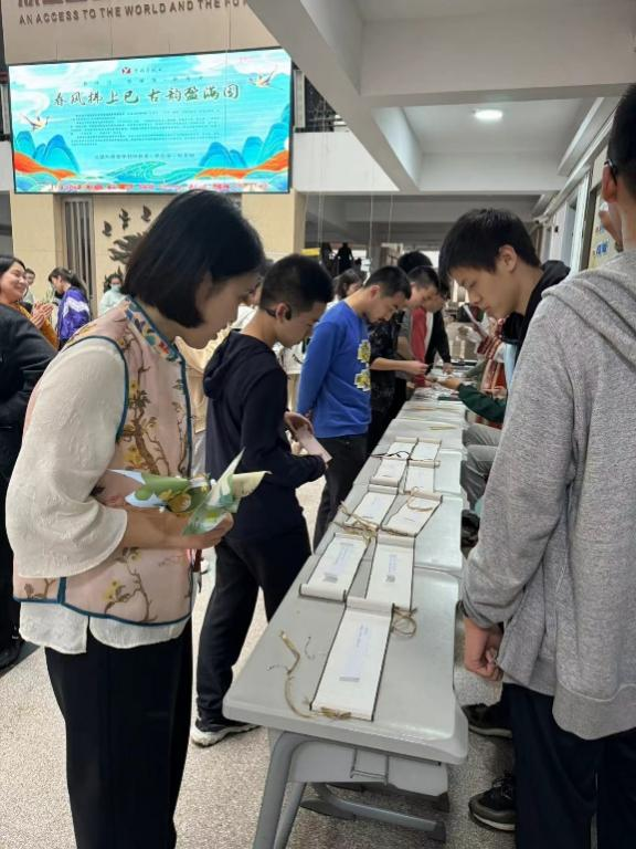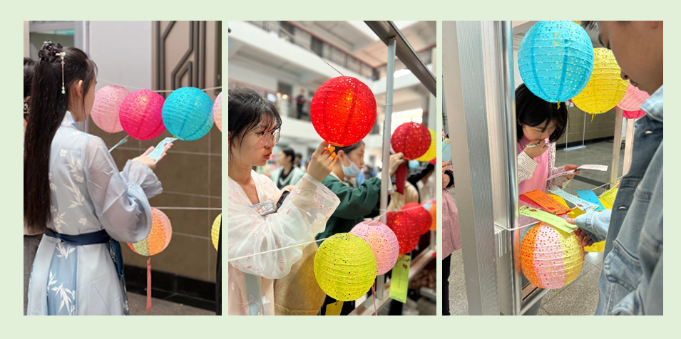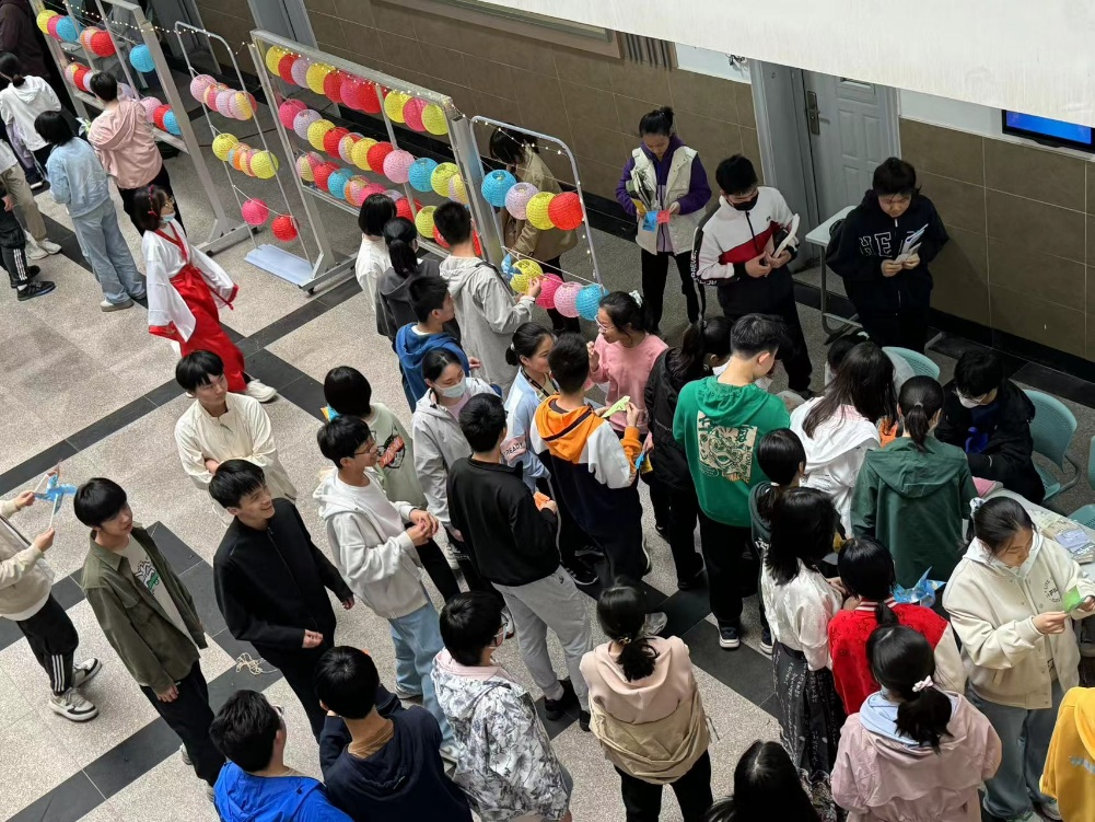 现场各式汉服裙摆飘摇,古筝奏乐如梦似幻,民族舞蹈美不胜收;上百个颜色缤纷的灯笼下,难度各异、别开生面的趣味灯谜排排悬挂,不断激发挑战者们解谜的热情,作答区域一度排起长队;会场的投壶体验区更是人头攒动,三列长队驱不散同学和老师们大显身手的热切希望。我校外教也被这种强烈的氛围所吸引,感受了中华文化的魅力。