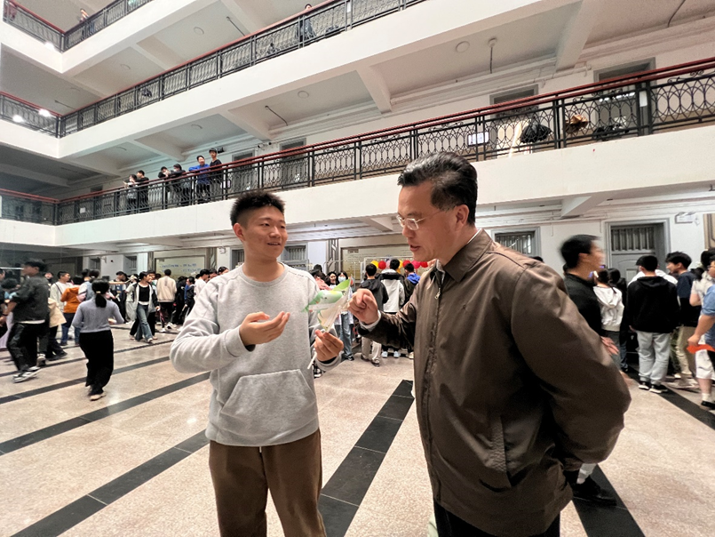 学生会文艺部部长江成同学向王校长介绍活动安排