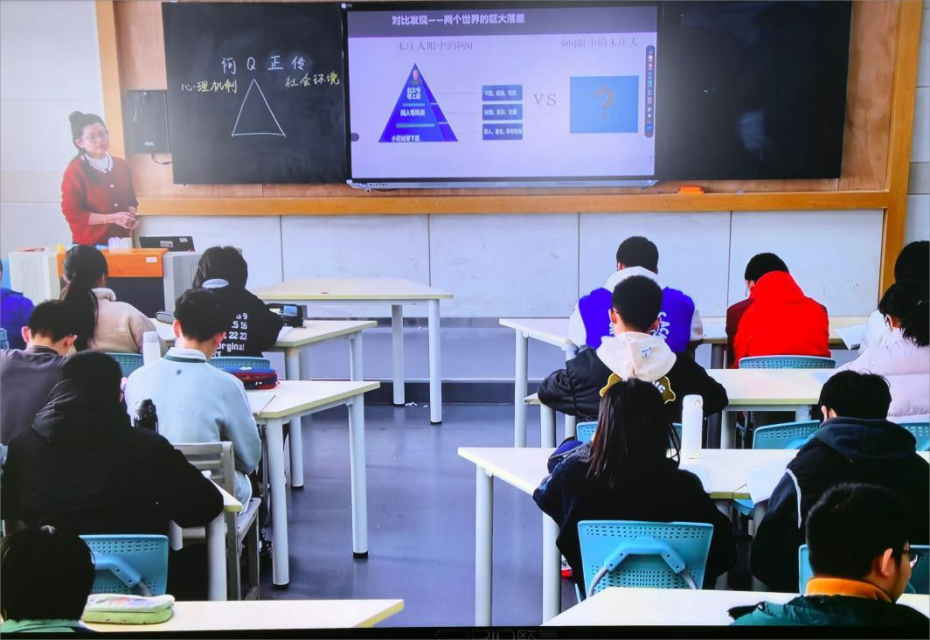 我校罗姣老师以“阿Q正传的前世与今生”为主线,引导学生通过阿Q资料卡梳理、“打与被打”情节分析等预习任务,层层深入剖析精神胜利法的核心特征;又依托“阿Q 2026”拓展模块,设计“身边的阿Q时刻”分享等趣味活动,让学生从经典文本走向现实生活。整堂课程层层递进,从文本探究到精神解读,再到现实联结,让学生在自主探究、合作交流中实现人物、作者与自身三者间的深度共鸣,让经典文学的教学既有文本厚度,又有现实温度。