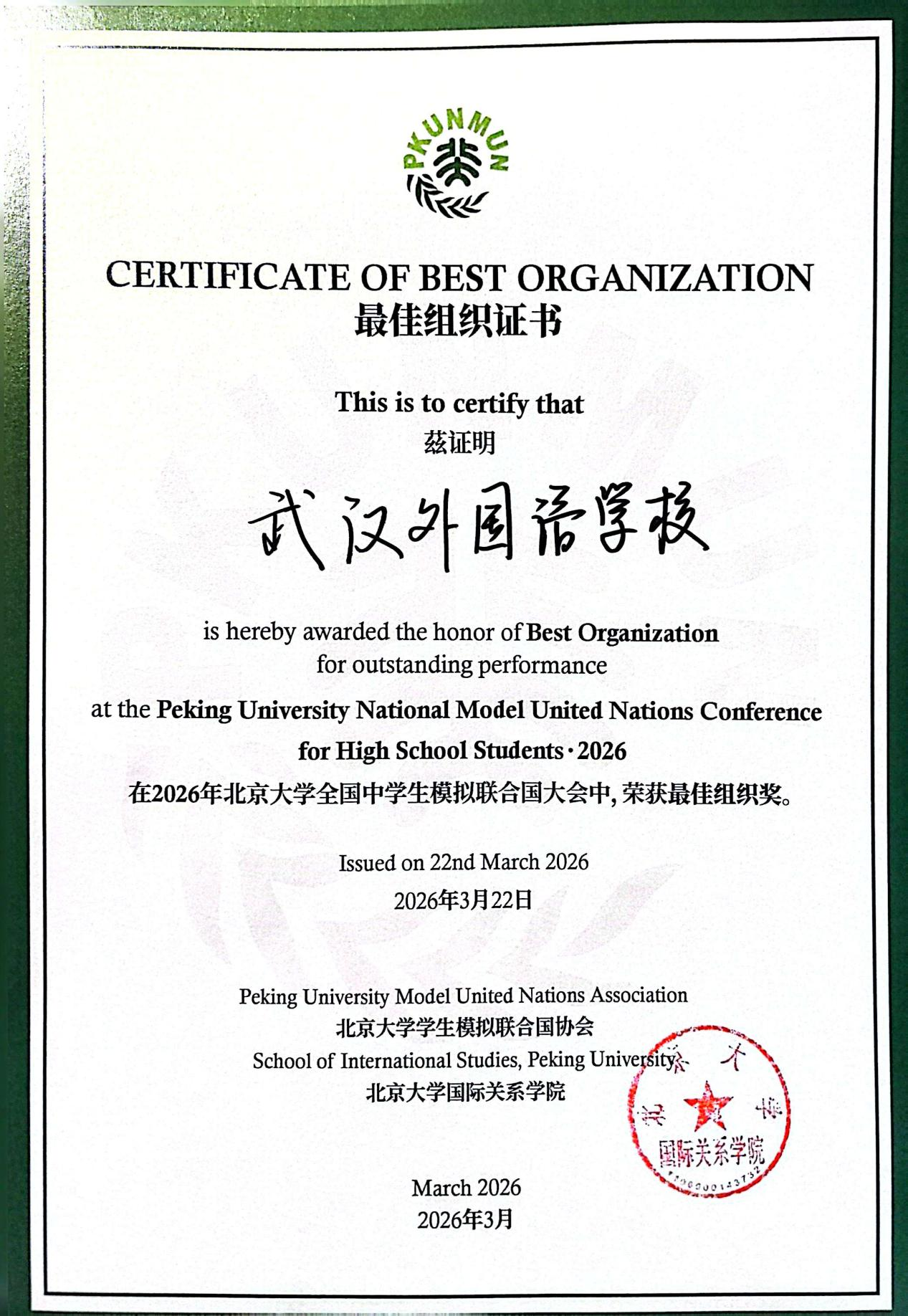 2026年3月20日至22日,2026年北京大学全国中学生模拟联合国大会(PKUNMUN2026)在北京圆满落幕。我校模拟联合国协会选派4名优秀代表,与来自全国各大高中的师生齐聚燕园,共赴这场兼具思辨性与实践性的模拟外交盛宴,在国际视野的碰撞中展现我校学子的卓越风采。