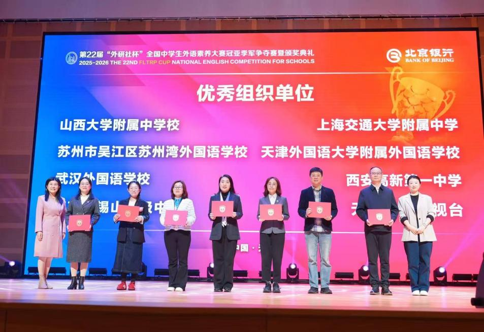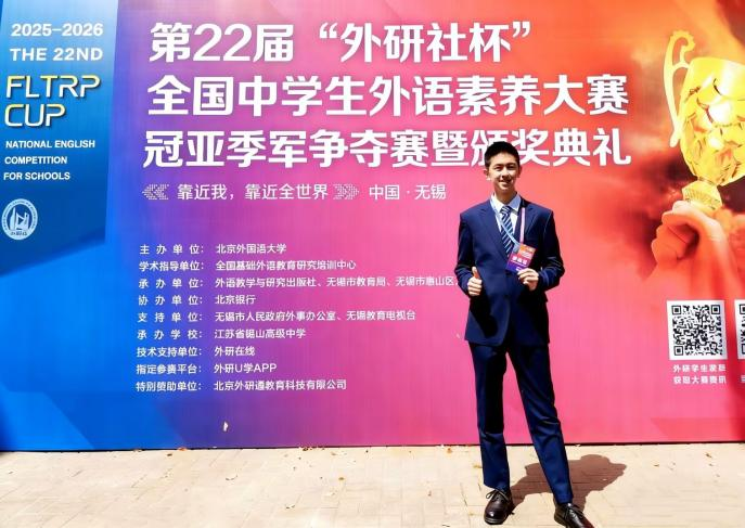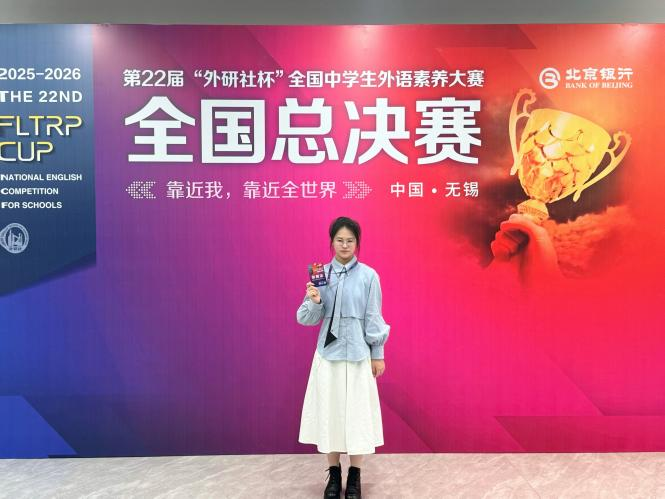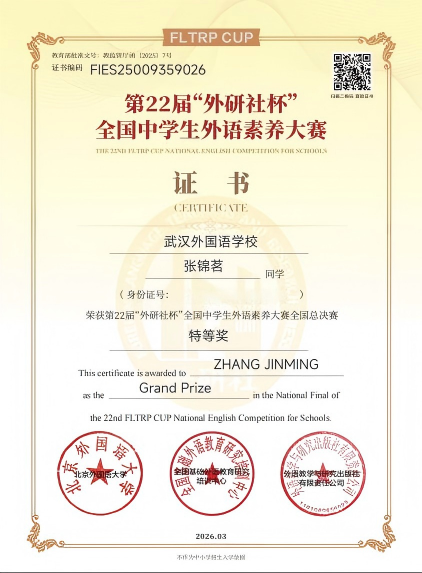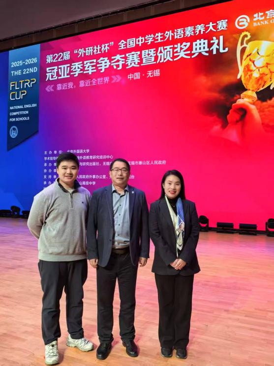 2026年3月30日,第22届“外研社杯”全国中学生外语素养大赛总决赛在无锡圆满收官,武外学子再创辉煌!全校7名晋级国赛的学子在全国顶尖比拼中脱颖而出,张锦茗、张玮熙斩获全国特等奖(全湖北仅2名),3人获全国一等奖,2人获全国二等奖,学校同时获评赛事最佳组织奖,郑敏副校长受邀出席领奖。先前在湖北省省级选拔中,124名学子先斩奖项,其中82人获省一等奖,用亮眼成绩彰显了武外外语教学的硬核实力。